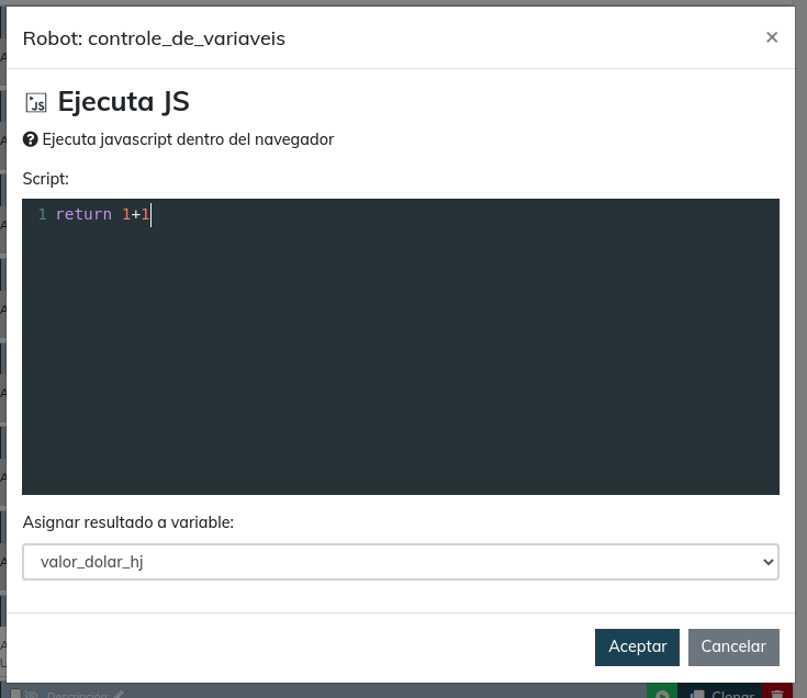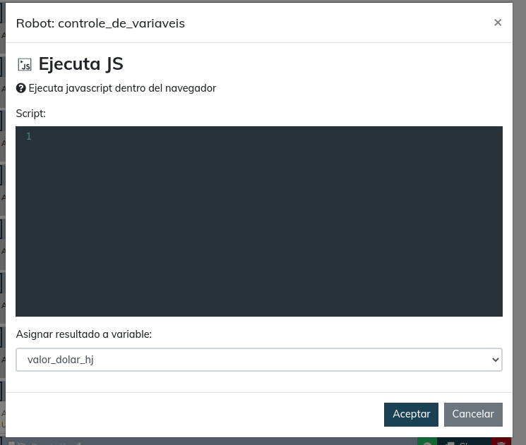 Boa tarde gente, estou tentando aplicar um código JS no meu robô porem o campo de script não salva o que eu escrevo, eu adiciono o código, seleciono a variável e dou ok porem ele não salva o q eu escrevi, n me da erro algum, somente fica como se eu n tivesse escrito nada, alguém sabe o que pode ser isso?