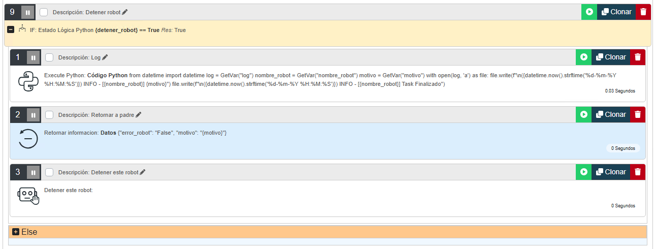 Estimados, favor su apoyo. Tengo un robot padre que ejecuta un robot hijo mediante un Ejecutar robot Rocketbot (expose), dentro del robot tengo repartido varios if que si la variable detener_robot == True crea un log, retorna información y detiene el ...